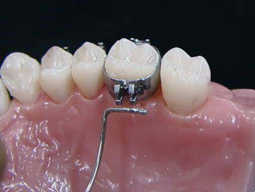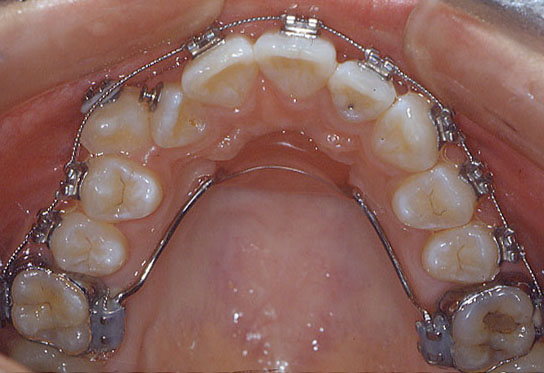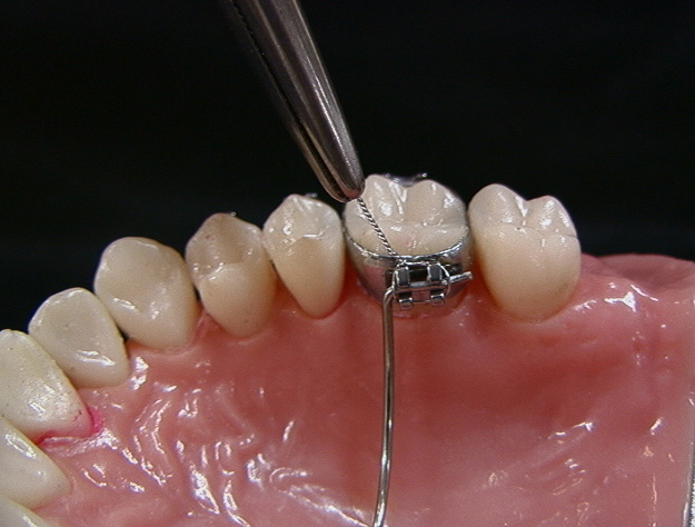 ; bracket slot에 위치할 wire 부분을 sandblasting한 다음 lingual arch를 010" 또는 011" ligature로 결찰하고 light cured (혹은 chemical cured) adhesive로 resin fixation.